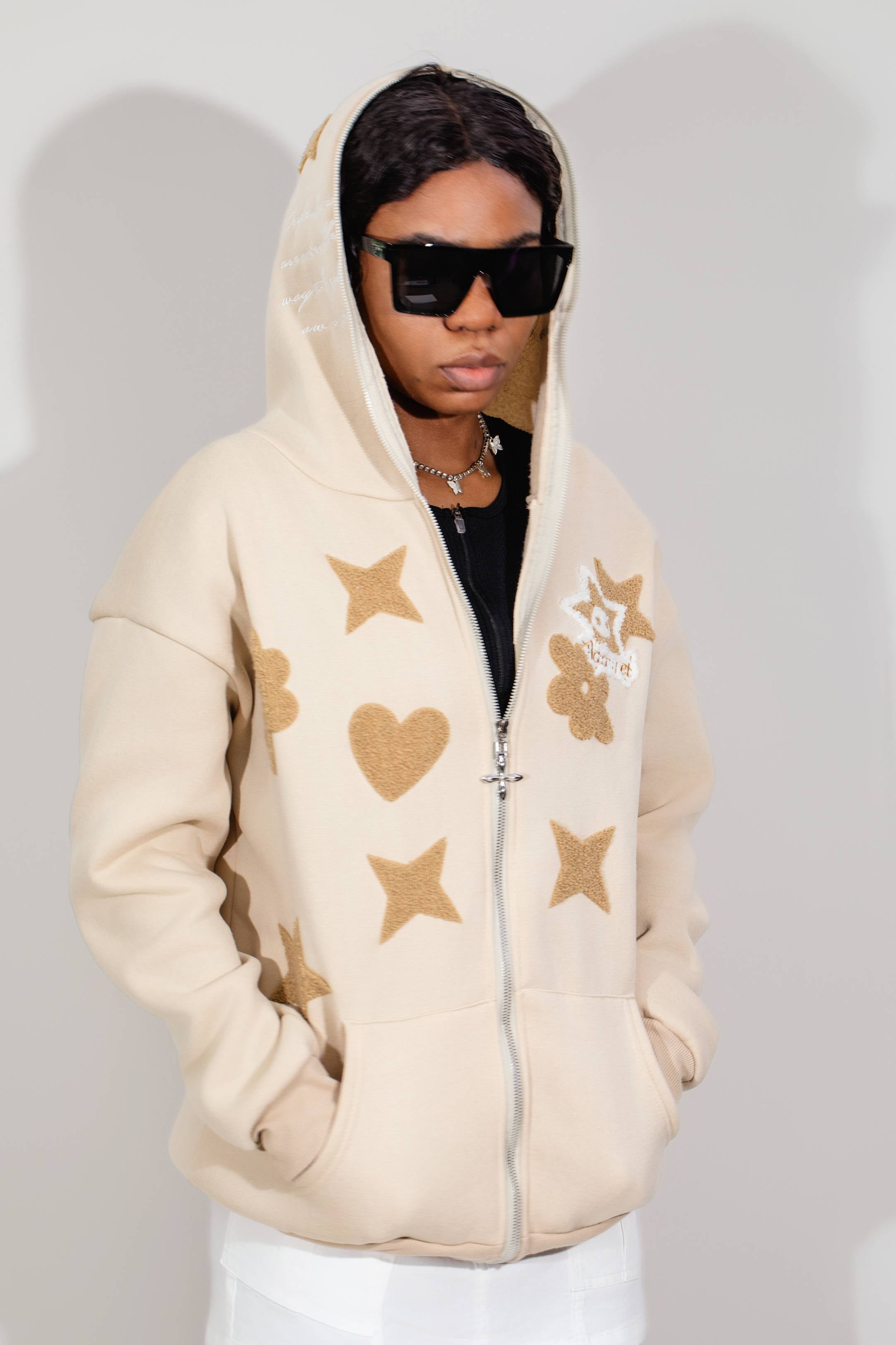 Rock your fashion game with our Apricot Zip Hooded Shirt featuring trendy star, heart, and skull designs. Stay stylish and comfortable in this unique and playful shirt. Perfect for everyday wear or a night out with friends. Your wardrobe needs this!